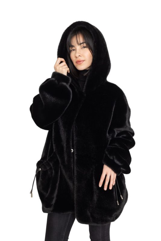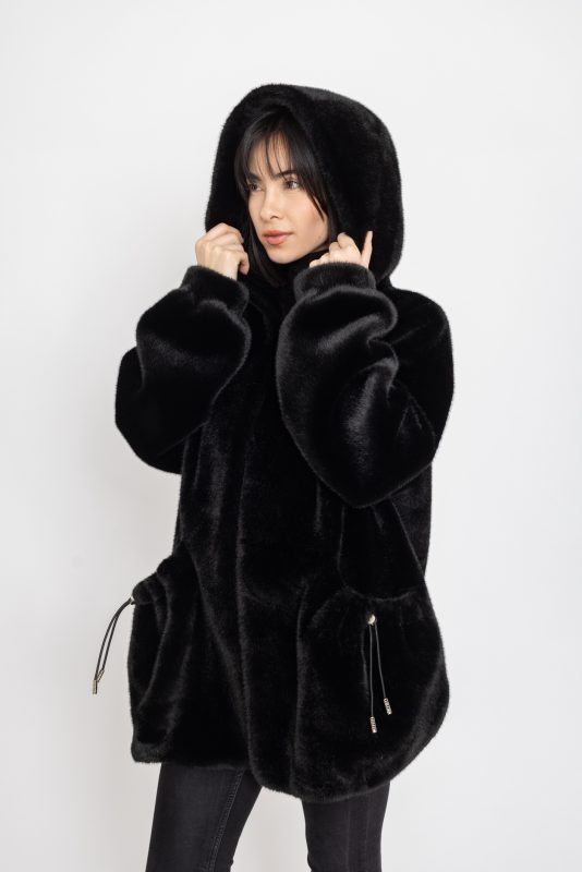 Manteau en effet fourrure à capuche Royal Mocha Noir