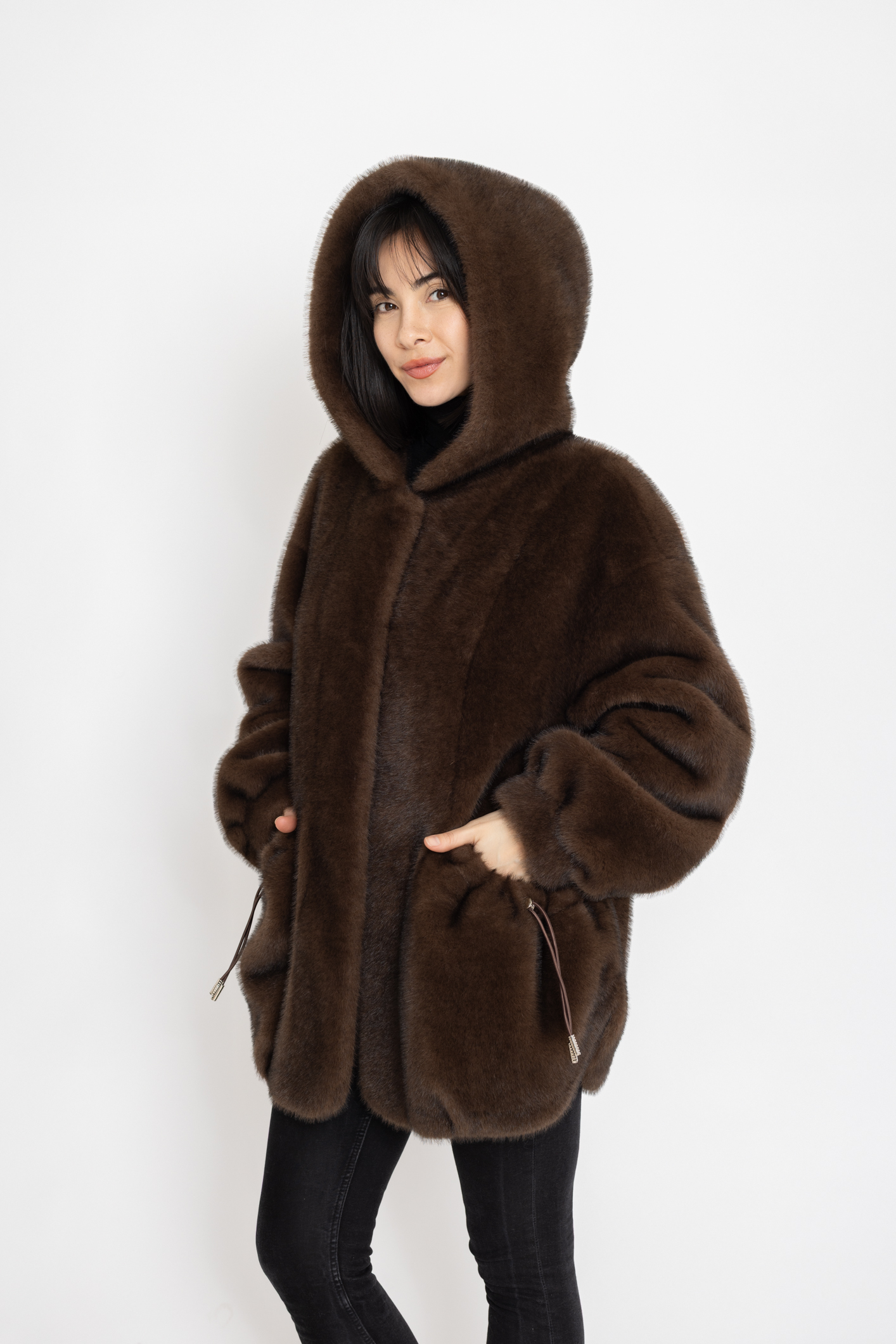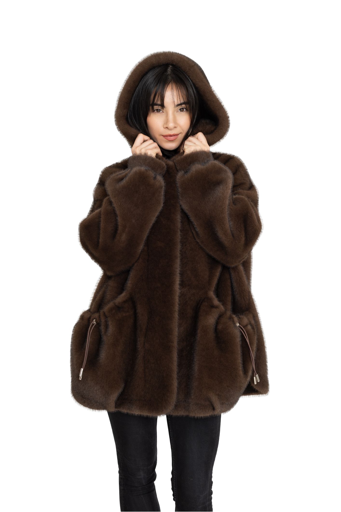 Manteau en effet fourrure à capuche Royal Mocha marron